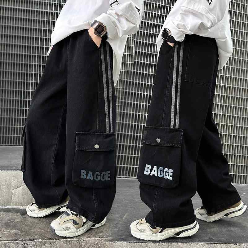 パンツ 男の子 カーゴデニムパンツ ジーンズ 春秋 ストレート ワイド ゆったり ルーズ ストリート系 おしゃれ トレンド 綿混 柔らか 普段使い 通学 小学生 中学生