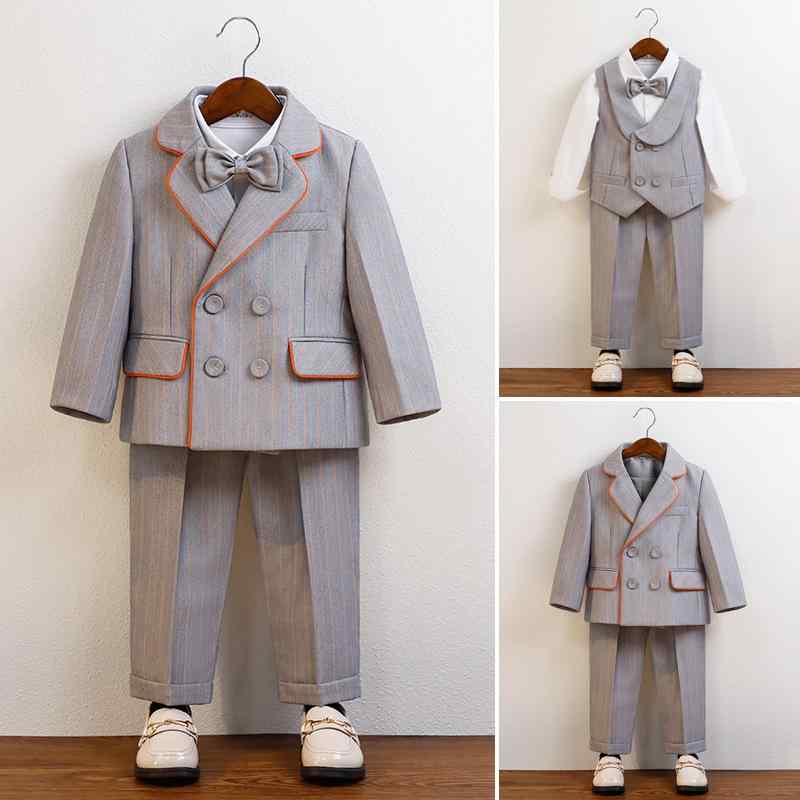 スーツ 男の子 キッズ ベビー 春秋冬 英国風 フォーマル セットアップ ストライプ ダブルボタン グレー テーラードジャケット ロングパンツ 長袖 結婚式 発表会 七五三 高級感 上品 おしゃれ かっこいい 子供服 礼服 スリム 襟 前開き 裏地あ