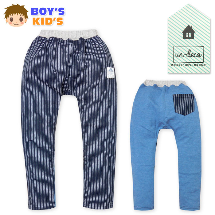 【送料無料】男児 キッズ サルエル ロング パンツ ミニ裏毛 ストライプ柄切替 ワッペン ウエストゴム ボトムス 子供服 男の子 110cm 120cm 130cm a-1766b-bl【メール便対応】
