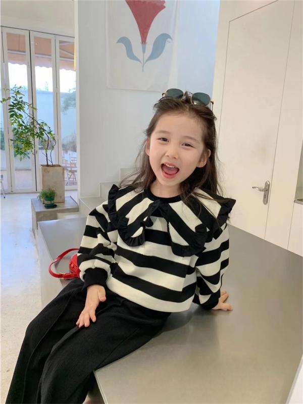 子供服 スウェット・トレーナー ガールズ 長袖トップス ストライプ柄 カットソー 女児 秋物 襟付き かわいい 裏毛 綿混紡 普段着 韓国風 ブラック レッド