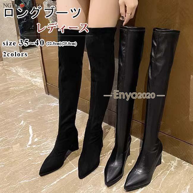 ニーハイブーツ レディース ロングブーツ ポインテッドトゥ チャンキーヒール ストレッチ ブーツ ロング丈 おしゃれ きれいめ 履きやすい 歩きやすい 美脚 黒