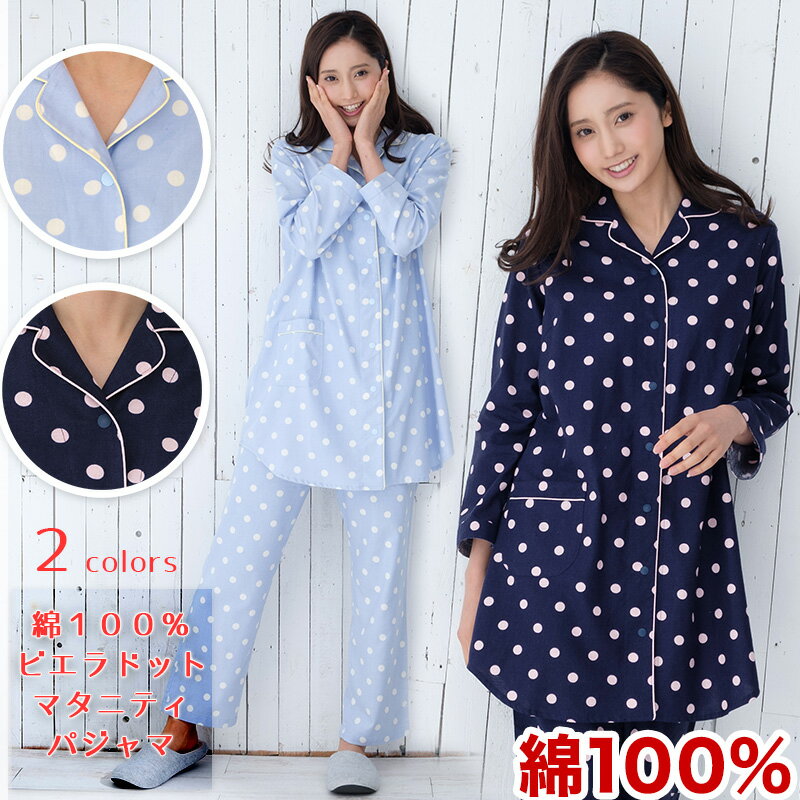 【マタニティ パジャマ】【綿100%】【秋・秋冬・春】【長袖】綿100%ビエラ ドット柄マタニティ パジャマ/前開き/マタニティ パジャマ 綿100/肌に優しい綿100% 長袖マタニティ パジャマ