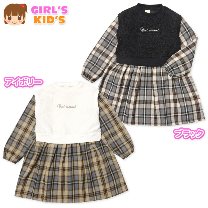 【送料無料】女児 キッズ 長袖 ドッキング ワンピース シープボアベスト重ね着風 ビエラ起毛チェック柄 子供服 女の子 110cm 120cm 130cm nw-0880【メール便対応】