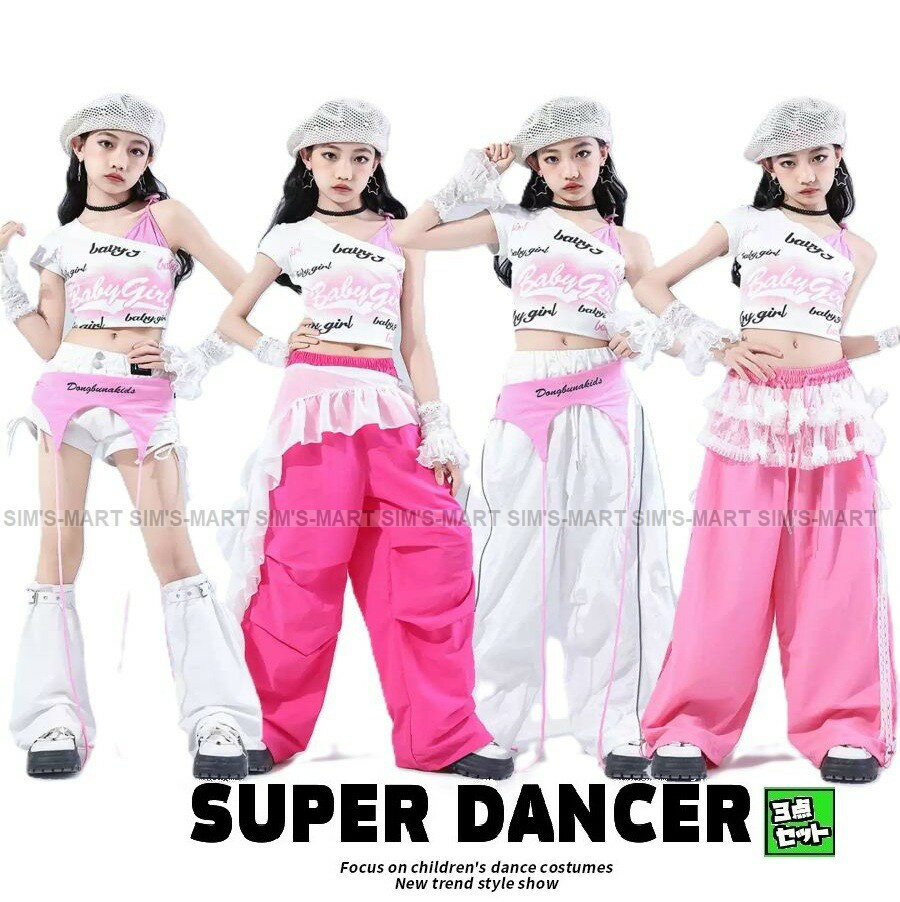 ダンス衣装 キッズ セットアップ 派手 白 ピンク K-POP 韓国 ガールズ ヒップホップ 衣装 子供ダンス服 ダンスウェア ダンス衣装 肩出し トップス フリル付き パンツ