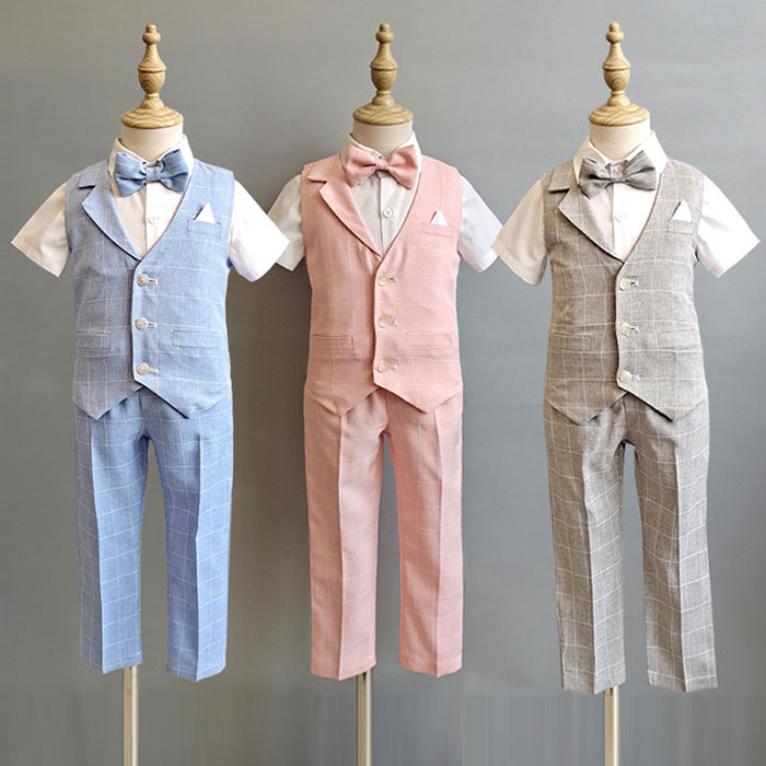スーツ 男の子 半袖 おしゃれ 子供スーツ 4点セット (ベスト パンツ シャツ ネクタイ) チェック柄 90 100 110 120 130 140 150 160 170cm キッズ ジュニア フォーマル こども 男児 小学校 小学生 発表会 結婚式 フォーマルスーツ ピンク グレー ブルー