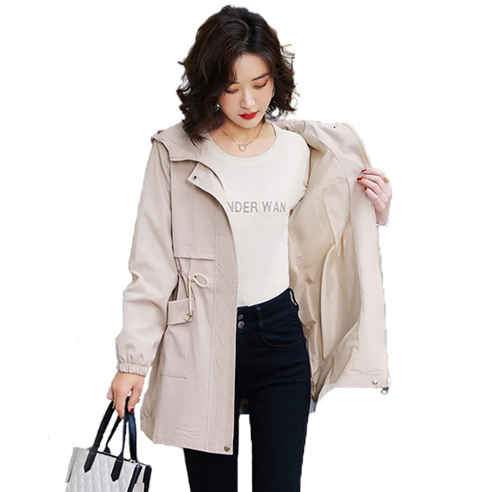 【送料無料】CLAZOLIY マウンテンパーカー レディース ブルゾン フード付き トレンチコート 長め丈 ジャケット 無地 裏地あり 通気 防風 春 秋 CL147 色:ベージュ、サイズ:XL