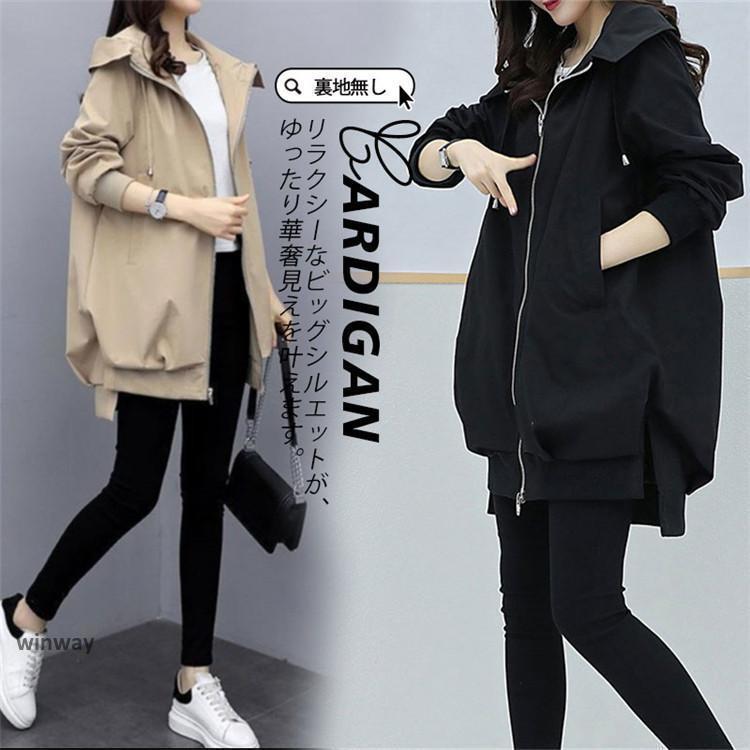 マウンテンパーカー レディース トレンチコート ミディアム丈 ウィンドブレーカー ファスナー 裹地無し フード付き ジャケット 羽織 アウター 春秋 ゆったり