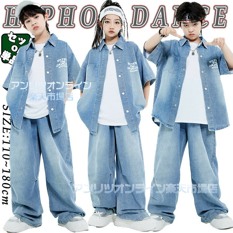 デニムセット デニム シャツ 青 キッズ ダンス衣装 半袖 セットアップ 女の子 男の子 トップス パンツ カジュアルシャツ ヒップホップ ジャズダンス ポッピング 演出服 練習着 団体服 応援団 発表会 普段着 韓国 k-pop hiphop jazz おしゃれ かっこいい 上下セット ブルー