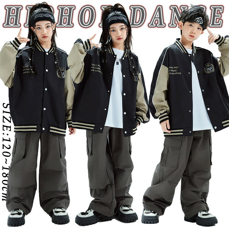 スタジャン キッズ ダンス衣装 灰色 グレー 男の子 女の子 ゆったり 長袖 ジャケット カーゴパンツ アウター トップス パンツ セットアップ かっこいい ダンスウェア ヒップホップ ジャズダンス ポッピング 発表会 演出服 練習着 団体服 応援団 おしゃれ hiphop jazz k-pop