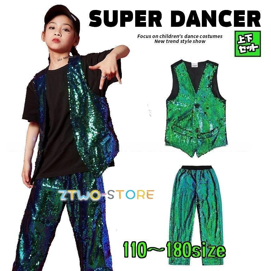 キッズダンス衣装 セットアップ ロックダンス衣装 ポッピン ジャズダンス スパンコール ベスト パンツ キラキラ ダンス衣装 緑