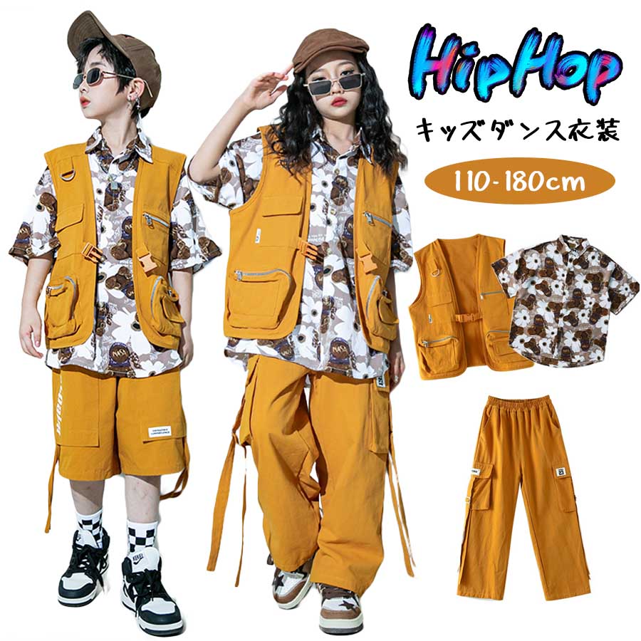 キッズダンス衣装 セットアップ ヒップホップ 黄色 韓国 ダンスウェア 女の子 男の子 かっこいい キッズダンス衣装 KPOP ダンス トップス 七分袖 花柄シャツ ベスト ハーフパンツ カーゴパンツ ワイドパンツ ポッピング hiphop ロッキング 韓国K-POP 演出服 派手 ゆったり