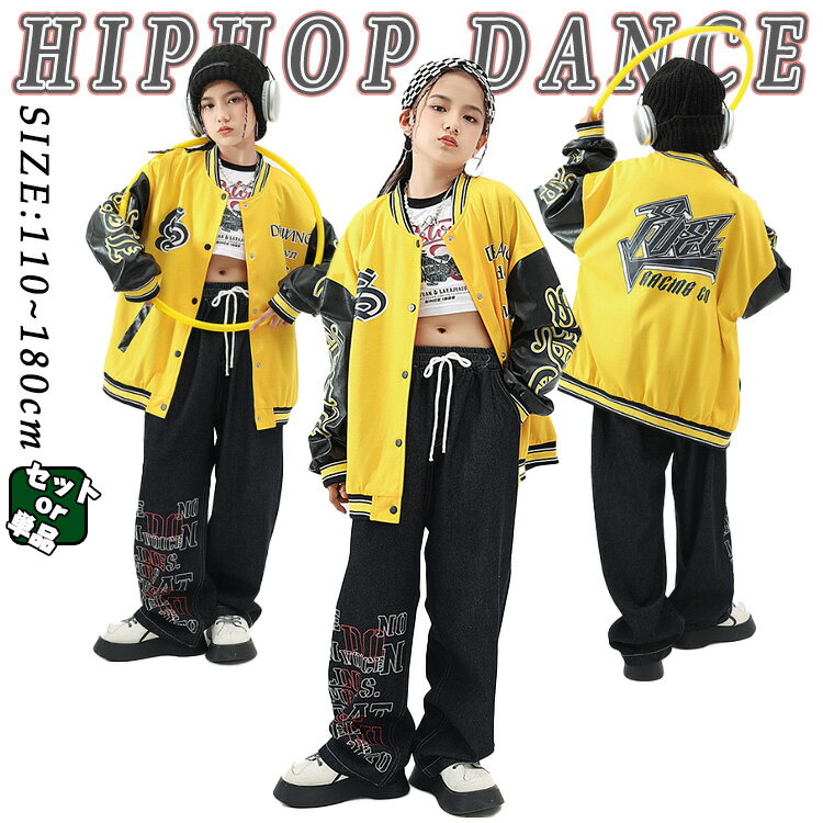 レーシングスーツ 黄色 ジャケット オシャレ 韓国 キッズ ダンス 衣装 スタジャン セットアップ ブラック デニム パンツ 子供 派手 ヒップホップ ポッピング k-pop ダンスウェア ゆったり服 団体服 練習着 普段着 演出服 カッコイイ 個性派 野球 ストリート サルエルパンツ