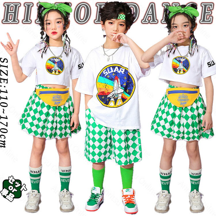 白 緑 キッズ ダンス 衣装 セットアップ かわいい おしゃれ かっこいい 男の子 女の子 ゆったり トップス Tシャツ タータンチェック スカート パンツ ポッピング ロッキング ジャズダンス ヒップホップ 派手 韓国 kpop 練習着 応援団 演出服 団体服 原宿系 発表会