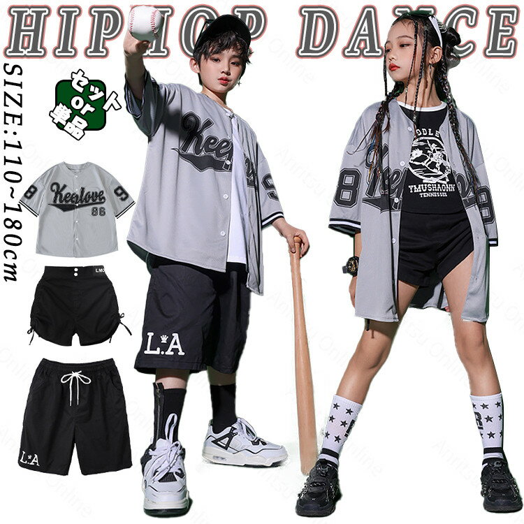 グレー ベースボールシャツ 半袖 夏 キッズ ダンス衣装 セットアップ 男の子 女の子 ショートパンツ トップス 短パン パンツ 上下セット ダンスウェア ヒップホップ ジャズダンス ポッピング 演出服 練習着 団体服 応援団 個性派 かっこいい おしゃれ ゆったり hiphop k-pop
