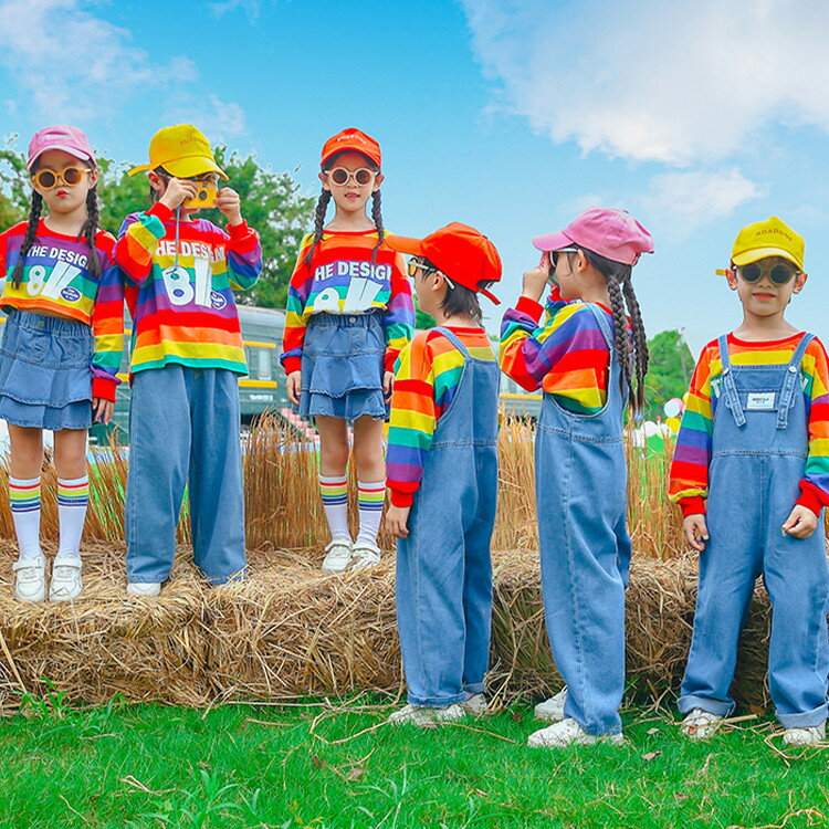 虹色 デニム 夏 キッズ ダンス衣装 オーバーオール パンツ スカート トップス パフォーマンス セットアップ 女の子 男の子 おしゃれ ゆったり カジュアルシャツ スポーツ ジャズダンス ヒップホップ ポッピング 合唱団 演出服 練習着 団体服 応援団 個性派 幼稚園 子供