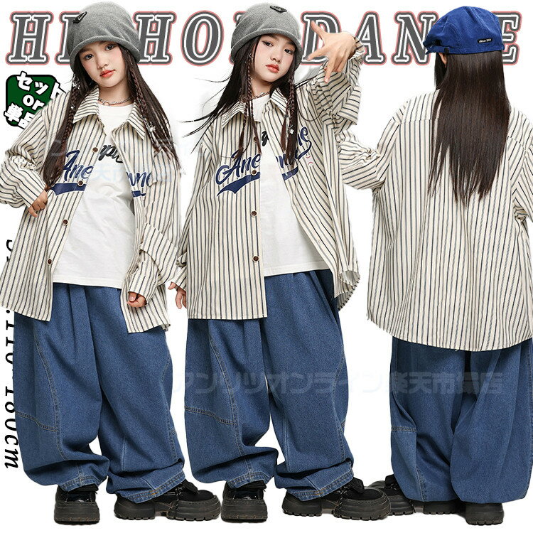 ゆったり 男の子 女の子 ストライプ デニムパンツ キッズ ダンス衣装 長袖 シャツ トップス パンツ 上下セット セットアップ かっこいい ダンスウェア ヒップホップ ジャズダンス ポッピング 発表会 演出服 練習着 団体服 応援団 個性派 おしゃれ ゆったり hiphop jazz k-pop