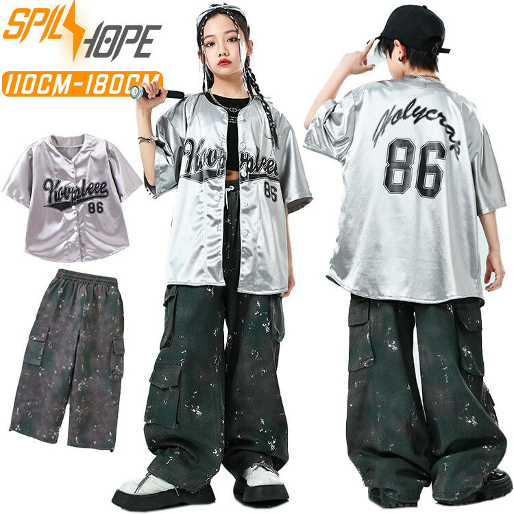 シルバー ベースボールシャツ カーゴパンツ 半袖 キッズ ダンス衣装 セットアップ 女の子 男の子 子供 子ども トップス パンツ ダンスウェア ヒップホップ ジャズダンス ポッピング 演出服 練習着 団体服 応援団 発表会 個性派 韓国 k-pop hiphop jazz かっこいい おしゃれ