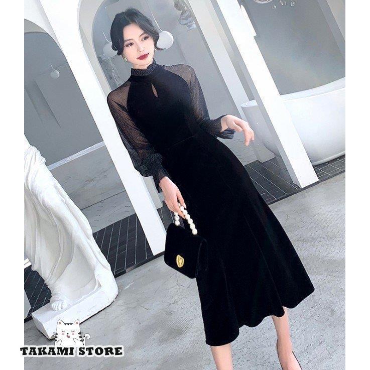 パーティードレス 結婚式 お呼ばれドレス 袖あり シースルー袖 長袖 黒 ミモレ丈 ミディアムドレス ワンピース フォーマル スタンドカラー 大きいサイズ 3L