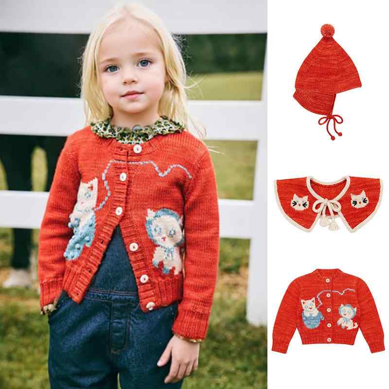 子供服 ニット 秋冬 レトロ 男の子 女の子 猫 刺繍 カーディガン 帽子 付け襟 セット かわいい あったか