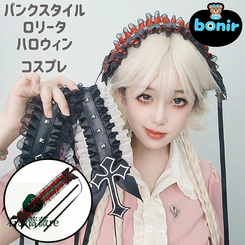 ヘアバンド ヘッドドレス コスプレ ハロウィン メイド服 ロリータ 甘ロリ 地雷系 ヴィジュアル系 サブカル女子 クロスモチーフ レース フリル ピンク レッド ブルー ヘアアクセサリー かわいい 個性 姫系 ロック系 原宿系
