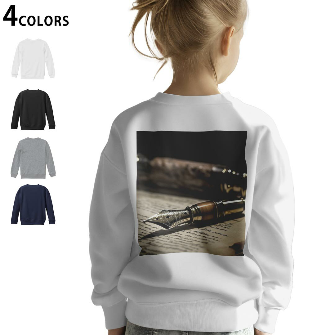 選べる3カラー バックプリント スウェットレーナー キッズ 男女兼用 男の子 女の子 ユニセックス unisex 長袖 デザイン リブ ホワイト ブラック 白 黒 グレー ネイビー 110 130 150 trainer sweat 036010 万年筆 レトロ 茶