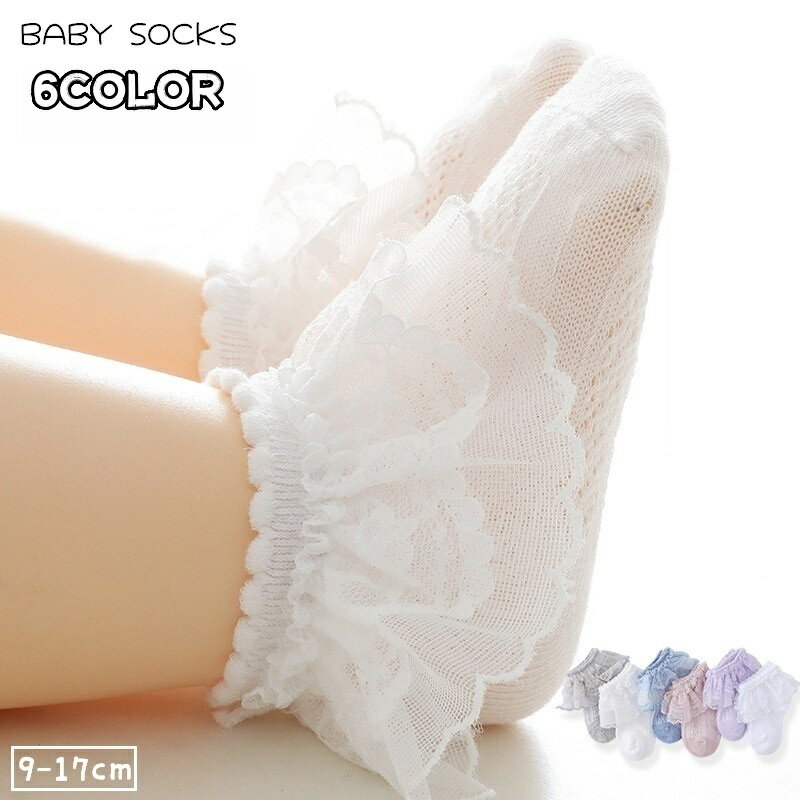 レースの透け感がかわいいベビー用ショートソックスです。 ちょっとしたプレゼントにも◎ 6種類のカラーからお選びください。 【サイズについて】 画像をご参照ください。 【カラーについて】 生産ロットにより柄の出方や色の濃淡が異なる場合がございます。 お使いのモニターや撮影時の光の加減などにより 画像と実際の商品のカラーが異なる場合もございます。 予告なしにカラーやデザインなどの変更がある場合もございます。 【素材について】 75%綿25%ポリエステル 【補足説明】 ※商品の性質上、手洗いでのお洗濯をお勧めしております。