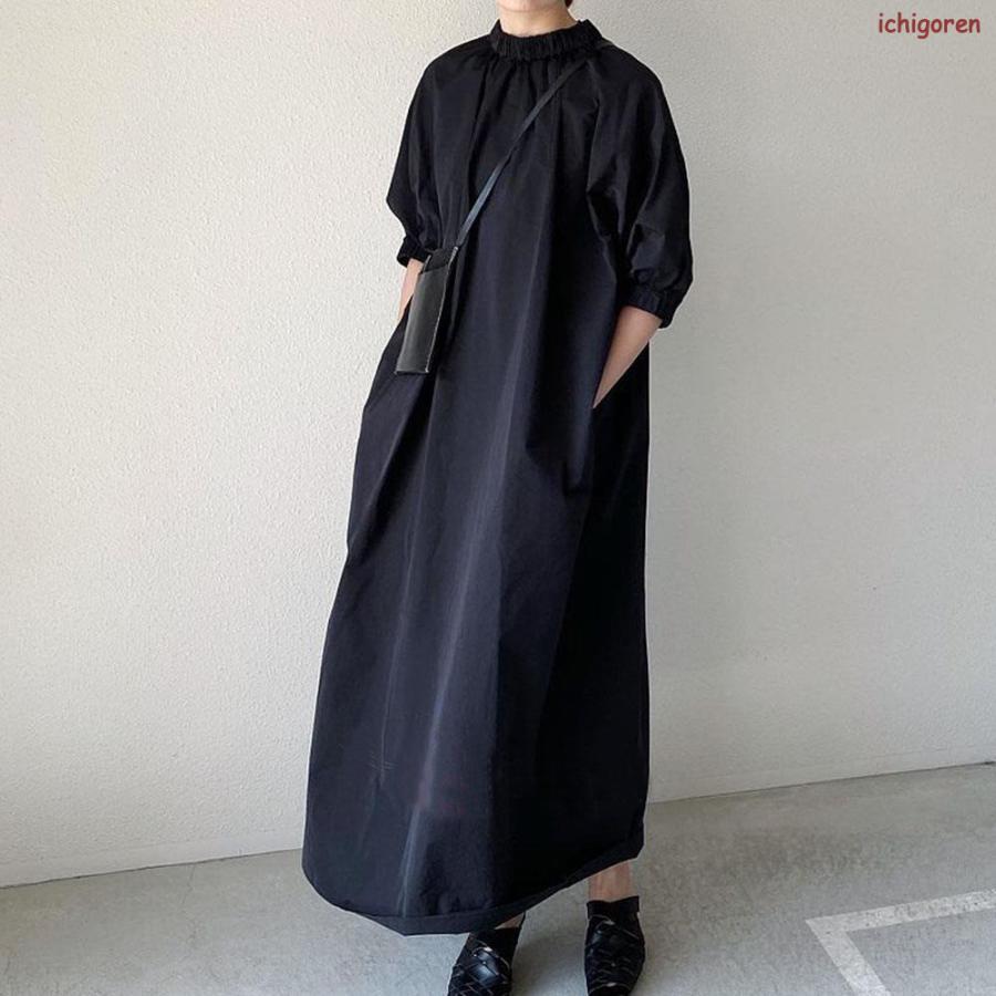 ワンピース ワンピ ロングワンピース ロングワンピ レディース マキシ丈 5分丈袖 Aライン フレア 無地 ゆったり おしゃれ きれいめ 綿麻 夏 フリル ギャザー 秋
