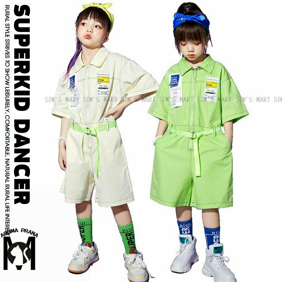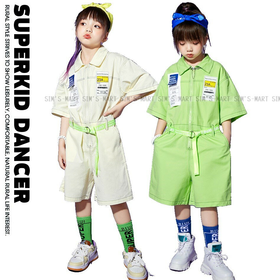 つなぎ キッズ ヒップホップ 衣装 キッズダンス衣装 子供ダンス服 作業服 オーバーオール 男の子 ガールズ K-POP 韓国 派手 黄緑 アイボリー 白