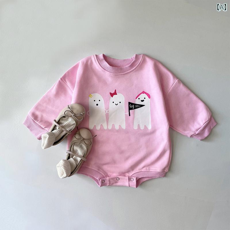 ロンパース ベビー 新生児 男女兼用 かわいい 個性的 ユニーク ゴースト柄 長袖 薄手 綿 コットン ハロウィン 仮装 秋 ピンク アイボリー