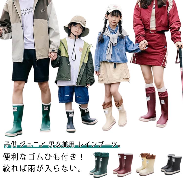 子供 ジュニア 男女兼用 レインブーツ。便利なゴムひも付き!絞れば雨が入らない。濡れた道でも滑らない。靴底は特殊形状の溝でグリップ力が高い。街中でもぬかるんだ道でも威力を発揮します。歩きやすく疲れにくい。従来の長靴と違って、柔らかくフィットする素材。足首が動かしやすく、スニーカー感覚で歩ける。上からも水が入らない。履き口部分はゴム入りで、絞る事ができる。脚にフィットさせれば、雨や泥が入らない。歩きやすくて、疲れにくい。アッパーもソールも柔らかいから、足の動きにぴったりッフィットして歩きやすい。立ったままでも脱ぎやすい。踵の出っ張りを反対の足で踏んで押さえれば、泥で汚れた靴に触らずに脱げる。丈夫だからガンガン使える。小石や枝で傷つきやすい足首から下部分は分厚く補強されているので、傷や破れに強い。足が痛くならない!高クッション性の厚手インソールで足に優しい。取り外しもできるので衛生的。 サイズ 子供用150mm 子供用160mm 子供用170mm 子供用180mm 子供用190mm 子供用200mm 子供用210mm 子供用220mm (36)23.0cm (37)23.5cm (38)24.0cm (39)24.5cm (40)25.0cm (41)25.5cm (42)26.0cm (43)26.5cm (44)27.0cm サイズについての説明 サイズ:子供用150mm 子供用160mm 子供用170mm 子供用180mm 子供用190mm 子供用200mm 子供用210mm 子供用220mm (36)23.0cm (37)23.5cm (38)24.0cm (39)24.5cm (40)25.0cm (41)25.5cm (42)26.0cm (43)26.5cm (44)27.0cm※サイズ計測には誤差が生じます。 素材 PVC 色 子供用黒 子供用ベージュ 子供用黒(絞り付き) 子供用ベージュ(絞り付き) 成人用緑 成人用ベージュ 成人用黒 成人用赤 成人用緑(絞り付き) 成人用ベージュ(絞り付き) 成人用黒(絞り付き) 成人用赤(絞り付き) 備考 ●サイズ詳細等の測り方はスタッフ間で統一、徹底はしておりますが、実寸は商品によって若干の誤差(1cm~3cm )がある場合がございますので、予めご了承ください。 ●製造ロットにより、細部形状の違いや、同色でも色味に多少の誤差が生じます。 ●パッケージは改良のため予告なく仕様を変更する場合があります。 ▼商品の色は、撮影時の光や、お客様のモニターの色具合などにより、実際の商品と異なる場合がございます。あらかじめ、ご了承ください。 ▼生地の特性上、やや匂いが強く感じられるものもございます。数日のご使用や陰干しなどで気になる匂いはほとんど感じられなくなります。 ▼同じ商品でも生産時期により形やサイズ、カラーに多少の誤差が生じる場合もございます。 ▼他店舗でも在庫を共有して販売をしている為、受注後欠品となる場合もございます。予め、ご了承お願い申し上げます。 ▼出荷前に全て検品を行っておりますが、万が一商品に不具合があった場合は、お問い合わせフォームまたはメールよりご連絡頂けます様お願い申し上げます。速やかに対応致しますのでご安心ください。