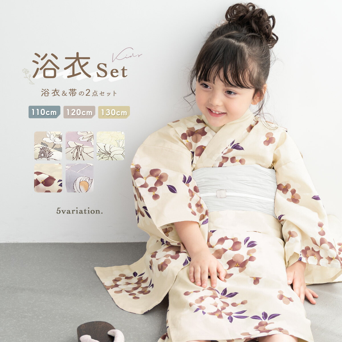 浴衣セット 女の子 キッズ 子供 兵児帯 2点セット 浴衣 セット 綿 子供服 くすみカラー モダン 薄茶 薄紫 黄色 ベージュ 紫 ポピー 百合 鬼灯 花柄 110 120 130 送料無料