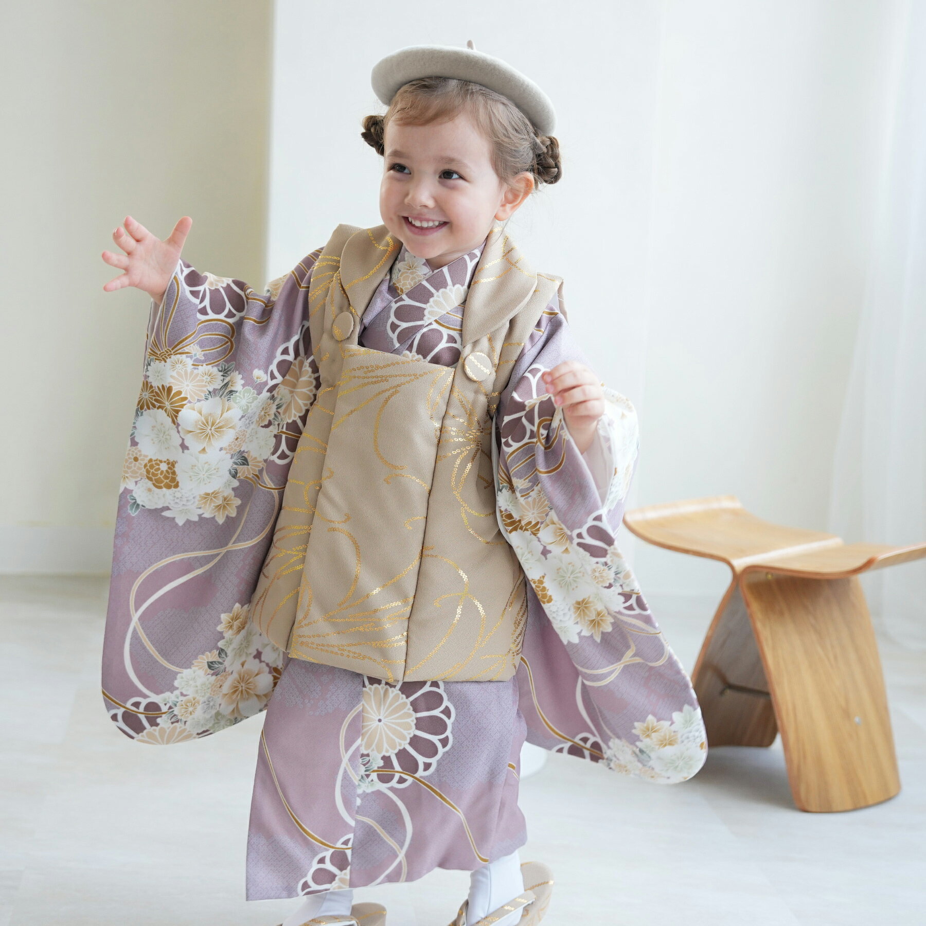 【レンタル】 七五三 3歳 着物 セット ひよこ商店 88cm-105cm前後 女の子 着物 花 被布セット 紫 子供 kids 三歳 三才 女児 被布コート 菊 疋田柄 久寿玉 金 ゴールド ニュアンスカラー 七五三参り 家族写真 往復送料無料