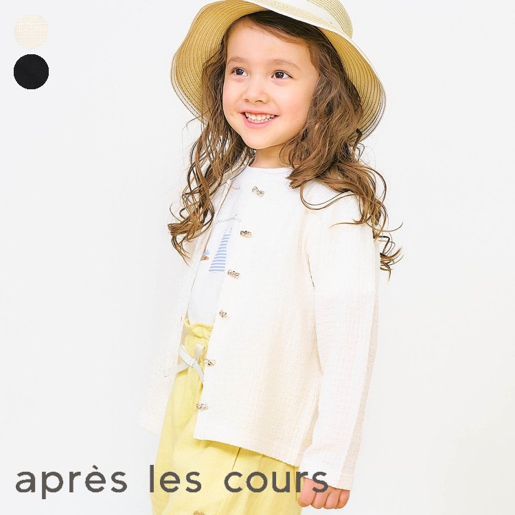 ※画像と実物の色がお使いのPC・ブラウザによって多少異なる場合がございます。 【2025初夏】 apres les cours(アプレレクール)のカーディガン・ボレロ「リボンボタンカーディガン」は、肌寒い時にサッと羽織れる便利アイテム◎着回し力抜群で1枚あると大活躍!インナーとの重ね着も楽しんで* ≪素材≫ ジャカードカットソー 本体:ポリエステル95% ポリウレタン5%衿ぐり:綿100% ≪取扱・洗濯方法≫ 40℃を上限に洗濯機で洗濯、デリケートアイテムモード、ネット使用、漂白剤禁止、色物は同系の色と一緒に、洗濯後直ちに取出し、タンブル乾燥不可、日陰で吊り干し、アイロン禁止、商業ドライクリーニング不可 ≪お取り扱いのご注意≫ この商品は着用中の摩擦や洗濯により毛羽の乱れ、毛羽脱落、毛玉が生じることが有ります。できるだけ美しくご利用頂く為に次のことにご留意下さい。○毛玉は毛玉取り器またはハサミで丁寧にカットして下さい。○毛羽が他に付着した際はテープやブラシで除去して下さい。○他の製品とは洗わず、単独でお洗濯して下さい。○タンブル乾燥はお避け下さい。この製品は特殊加工(スパンコール・ラインストーン・スタッド等)を使用しております。永久的なものではなく、着用中の強い摩擦や洗濯を繰り返すことにより、破損したり、光沢が消失していく可能性があります。できるだけ美しくご利用頂く為に次の事にご留意下さい。○ もみ洗い、タンブラー乾燥は避けて下さい。○ 脱水はネットに入れ、弱くかけて下さい。○ 装飾品にはアイロンを当てないで下さい。 ≪サイズ表≫ サイズ計測方法についてはこちら サイズ(cm)身丈身幅肩幅袖丈袖口幅 80323022278.59034312329.58.510037332533911040342637.5912043362841.59.513046383045.59.514049403249.510 ※商品により多少の誤差が生じる事がございます。あらかじめご了承下さい。 ※サイズ表の寸法は指示寸となります。平置きの状態で、基本的に商品の【外寸】となります。(靴・サンダルなど一部例外あり)※靴類・雑貨類などサイズ表の記載がない商品は、ご利用ガイドのサイズ目安をご参照ください。 ※モデル着用写真についてはイメージの為、実際の商品とカラーや仕様が異なる場合がございますので、商品画像をご覧ください。 ※実店舗と実施しているイベント内容が異なる為、販売価格が異なる場合がございます。 apreslescours apreslescours アプレレクール apres les cours apreslescours 羽織り カーディガン 軽アウター 女の子 メーカー希望小売価格はメーカー商品タグに基づいて掲載しています⇒こちら