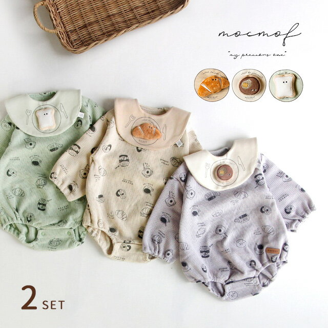 mocmof ベーカリー柄ロンパース&スタイセット(ロンパース 男の子 おしゃれ 女の子 長袖 かわいい 春服 ボディスーツ ベビー 70 ベビー服 セット 可愛い 赤ちゃん スタイ クロワッサン パンケーキ 食パン ベビーロンパース 秋 ベビースタイ よだれかけ ギフト 出産祝い)