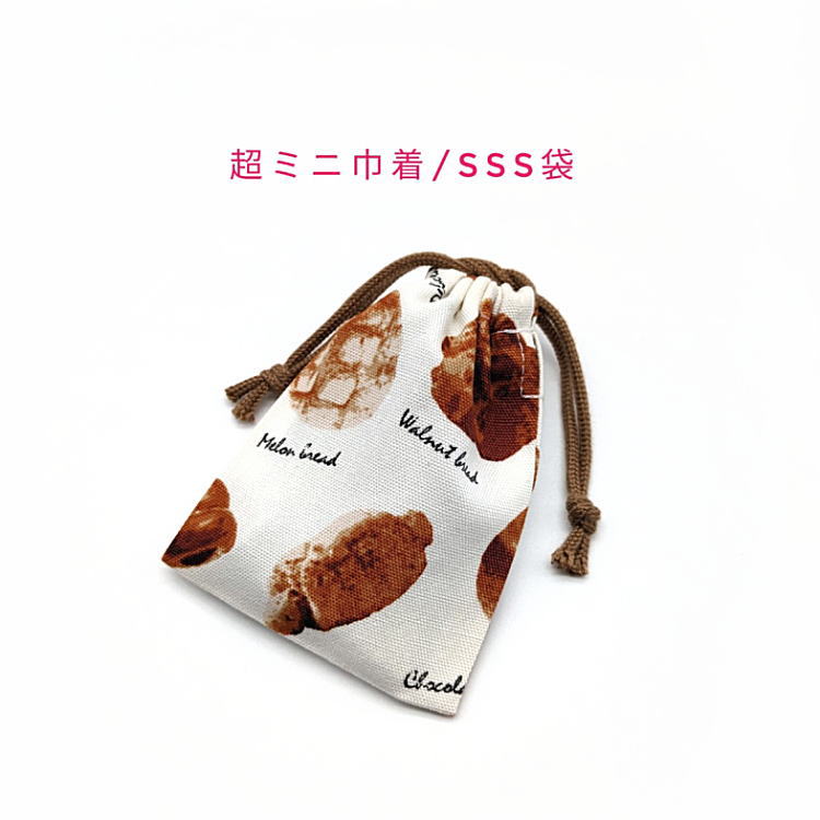超ミニ巾着袋・SSS袋(11cm×8cm)【ベーカリーパン柄 オフホワイト】巾着 ポーチ お守り入れ 小物袋 菓子袋 小さい袋 プリント マチ無し 日本製 プレゼント 可愛い 洗える コットン生地 綿 布 イヤホン リップ 化粧品 薬 ハンカチ マスク ぱん ブレッド 食パン メロンパン