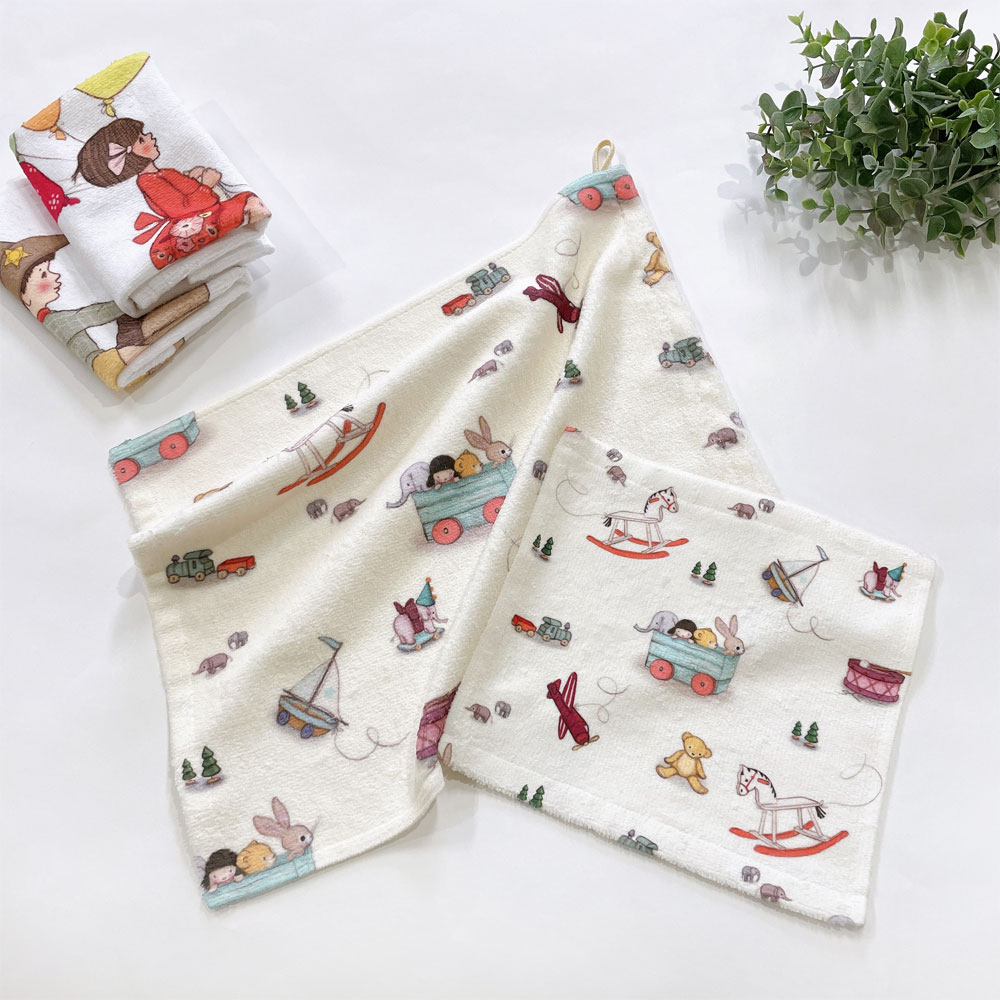Belle&Boo ループ付きタオルの詳細 ブランド Belle&Boo / ベルアンドブゥ イギリスで人気の「Belle&Boo」の絵本は ボブヘアーの女の子ベルと そのお友達のうさぎのブゥのお話。 作者のマンディ サトクリフさんの描く どこか懐かしい優しい絵とお話は 日本でも「ベルとブゥ」の絵本として 翻訳され、発売されています。 アイテム名 タオル/ハンドタオル/ハンカチ ループタオル/ループ付きタオル 素材 表面:ポリエステル 裏面:綿 サイズ ハンドタオル:約20×20cm ループ付きタオル:約33×38cm ※タオルの大きさには1枚1枚ばらつきがあり、 1〜3cm程度の個体差があります。 上記は、およそのサイズとなりますので、 何卒ご了承くださいませ。 ご注意 ※タオルの性質上、インクがのっていない箇所がある場合がございます。 ※タオルの大きさには1枚1枚ばらつきがあり、1〜3cm程度の個体差があります。 ※お洗濯の際は、蛍光剤入り洗剤のご使用はお避けください。 ※水に濡れたままの放置はお避けください。 ※タオルは生産ロットにより、色味が若干異なる場合がございます。 ※画面上と実物では多少色具合が異なって見える場合もございます。 【 配送方法につきまして 】 ※ポスト投函による配送方法となります。 ※配送日時のご指定は承ることが出来ません。 ※ラッピングご希望の場合、配送中、 リボン等に多少のずれや変形が生じる恐れが ございますため、宅配便をおすすめ致します。 ※複数点(別商品を含む)ご注文頂き、 ポスト投函配送サイズ規定外となった場合は、 複数通または配送方法を ご変更させて頂く場合がございます。 (その際に送料がご変更となる場合もございます。) 何卒予めご了承頂けますようお願い致します。 ループ付きタオル ハンドタオル フェイスタオルBelle&Boo好きにはたまらない! 【 ハンドタオル&ループ付きタオルセット 】 Belle&Booのかわいいキャラクターたちと一緒にお出かけ♪ コンパクトなハンドタオルと 便利なループ付きタオルのセット。 男の子にも女の子にもおすすめ! 同じ柄のセットでご用意♪ 便利なループとお名前タグ付き。 ループは柄によって色が異なります。 【ピンク】 1.Balloon 、4.Mushroom 、 7.Ava 【ベージュ】 3.Donkey 、 5.Toybox 、 6.Dinosaur 【グレー】 2.Meadow all 、 8.cheerful タオルの表面は、発色か良く綺麗な プリントに仕上がるようポリエステル素材、 裏面は吸水性のある綿素材を使用。 とてもやわらかく、ソフトな肌触りです! ■ご要望にお応えして!■ ダイナソーから、絵柄が上を向くよう、デザイン・ループ位置を変更いたしました! ループで下げてもよりかわいく見えます♪ その為、サイズが他の柄より縦長となります。 ※順次、他の柄も変更いたします。 保育園や幼稚園の入園準備、普段使いはもちろん、 ご出産祝いなどのギフトにおすすめです★ 他にはない出産祝い・ギフトになります!