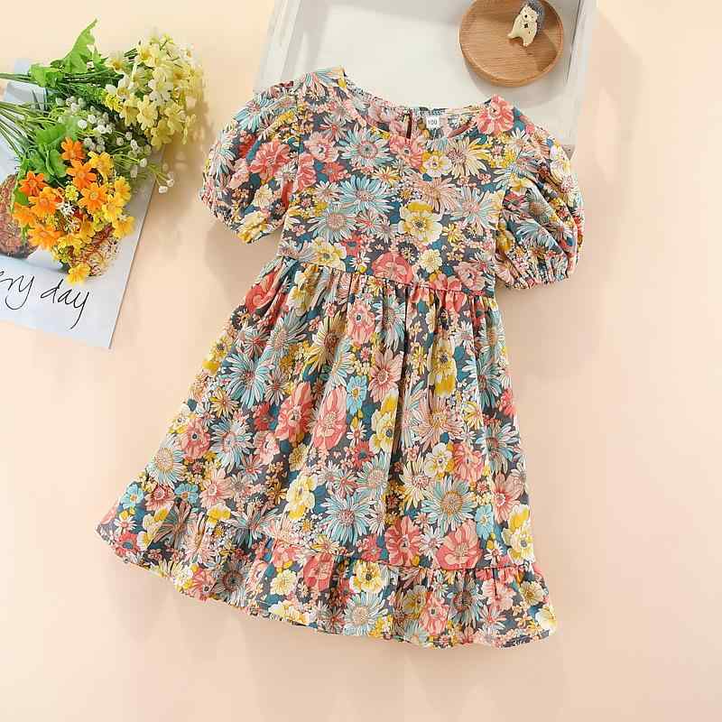 ワンピース 女の子 女児 キッズ ベビー 夏 サマー プリンセスドレス 半袖 ランタンスリーブ パフスリーブ レーヨン ビスコース 再生繊維 小花柄 フラワー柄 牡丹柄 フリル 荷葉フリル 田園風 普段使い お出かけ かわいい 上品 インフルエンサー