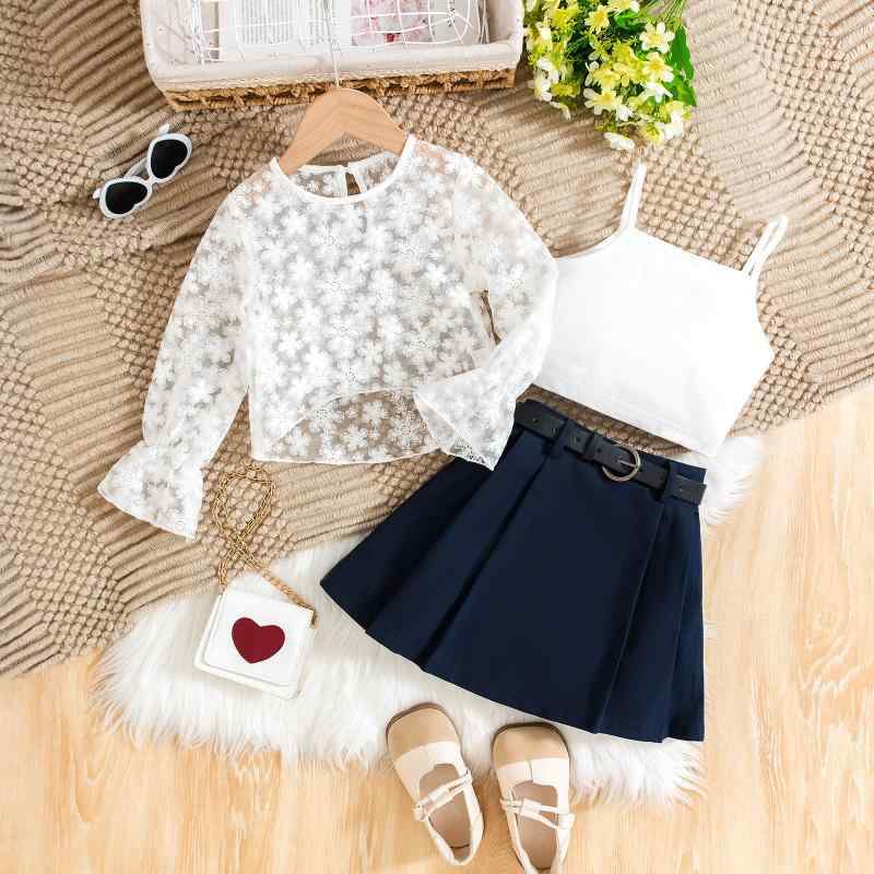 キッズ 女の子 秋冬 花柄 透かし編み 長袖 トップス 白 キャミソール 黒 ベルト付き プリーツスカート 3点セット 綿混 カジュアル フォーマル お出かけ