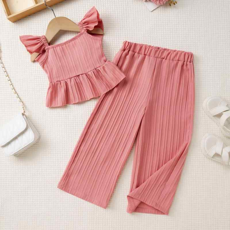 セットアップ キッズ 女の子 フリルスリーブ トップス ワイドパンツ 上下セット フリル リボン 無地 カジュアル 薄手 ポリエステル製 快適 春夏 お出かけ 普段使い 2点セット