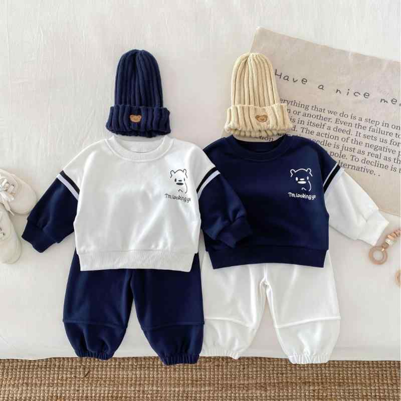 子供用スウェットセットアップ 韓国風 小熊プリント 切り替えデザイン 長袖トップス ロングパンツ 上下セット 春秋 普段着