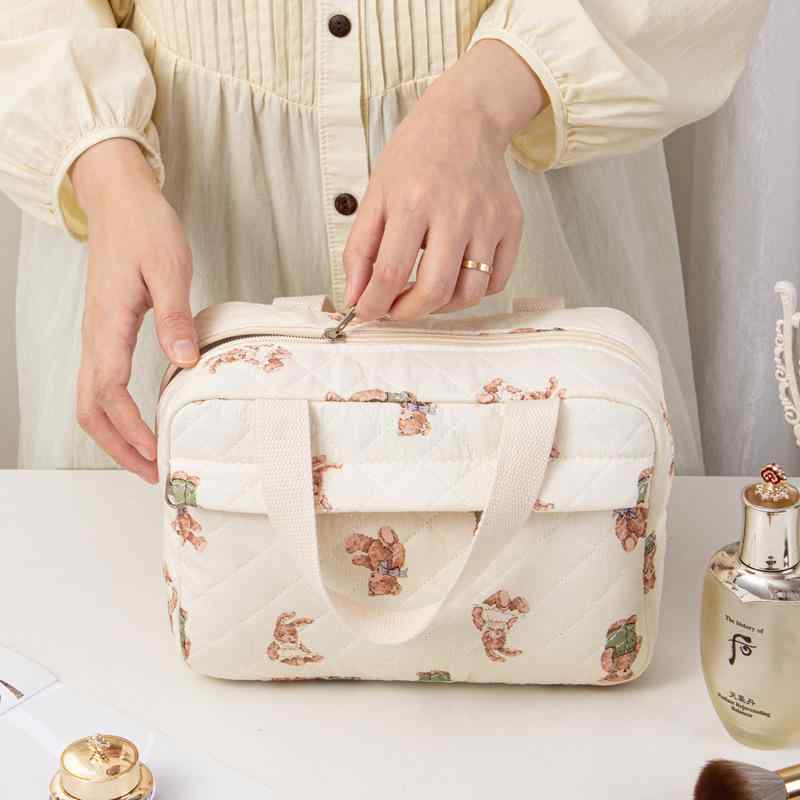 化粧ポーチ レディース 大容量 コットン キルティング 花柄 かわいい 旅行 白 ピンク系 熊 ベア