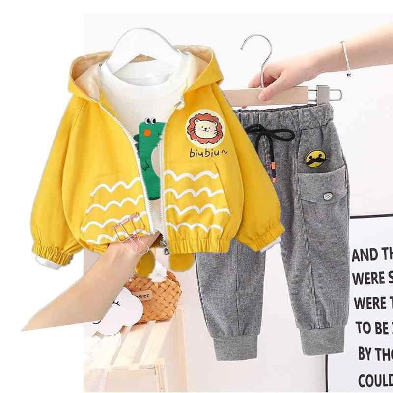 ベビー キッズ 男の子 春夏 セットアップ 上下セット 3点セット フード付き パーカー アウター 長ズボン 綿 コットン アニマル柄 キャラクター 韓国風 おしゃれ ライトグレー ダークグレー カーキ 普段使い お出かけ 通園
