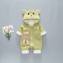 ロンパース ベビー 新生児 くま ポケット フード付き 前開き カバーオール 赤ちゃん 長袖 薄手 かわいい 春秋 おでかけ カジュアル ポリエステル グリーン カーキ