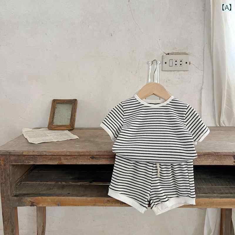 上下セット ベビー服 快適 韓国 ベビー ストライプ 半袖 トップスと ショート パンツ ツーピース スーツ 幼児と 幼児用 夏 男の子と 女の子 スポーツウェア