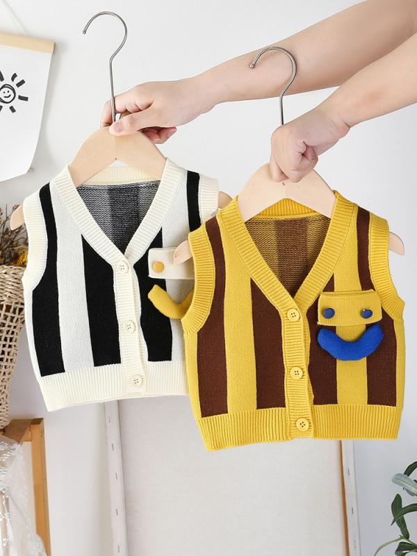 ニットベスト 子供 男の子 ベビー 前開き Vネック 縦ストライプ スマイル柄 かわいい 保温性 秋冬 普段使い 通園 黄色 白色