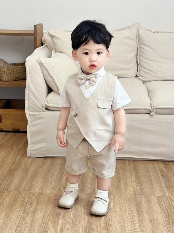 ・カテゴリ: キッズセットアップ・性別: メンズ・スタイル: 欧米風・セット内容: パンツセット・セット点数: 3点セット・内容物: 衣料品・対象年齢: 3〜8歳・袖丈: 半袖・パンツ丈: ショート丈・生地加工: 柔軟加工・生地の厚さ: 普通・柄: ストライプ・着用イメージ: モデル着用実写・デザイン要素: セットアップ、ストライプ、可愛らしい、蝶結び、欧米風・縫製: 1インチあたり12〜14針・仕上げ: 余分な糸の処理済み・主な素材: 綿95%・安全基準: B類・開閉タイプ: シングルブレスト・カラー展開: カーキ・サイズ展開: 73cm, 82cm, 91cm, 100cm, 109cm, 118cm, 128cm