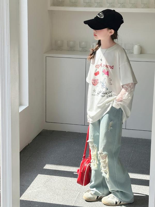 ガールズ セットアップ 春夏 おしゃれ 韓国 ツーピース 小学生 ジュニア デニム 綿 薄手 半袖 長ズボン 柔らか素材 パンツスタイル プルオーバー