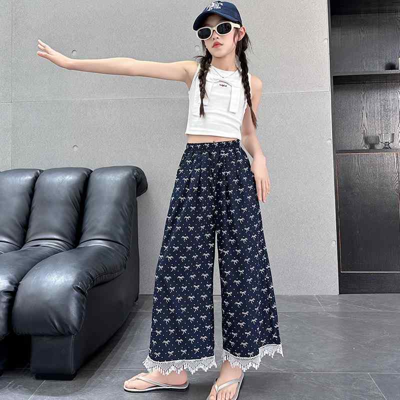 パンツ 女の子 キッズ ジュニア 春夏 防蚊 カジュアル ゆったり ワイドパンツ クロップド丈 リボン フリル ハイウエスト ポリエステル レーヨン