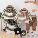 ベビー服 男の子 女の子 春秋 ポロシャツ スウェット ストライプ柄 綿 コットン素材 柔らかい肌触り 長袖 長ズボン カジュアル セットアップ 2点セット 普段着 お出かけ かわいい おしゃれ トレンド 黒 ダークグリーン コーヒー色
