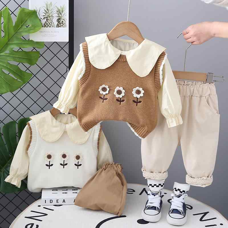セットアップ 女の子 ガールズ キッズ 春秋物 韓国子供服 かわいい おしゃれ トレンド 花柄 綿 コットン素材 三つ花 ニット ベスト 3点セット ベビー服 幼児服 お出かけ 普段使い